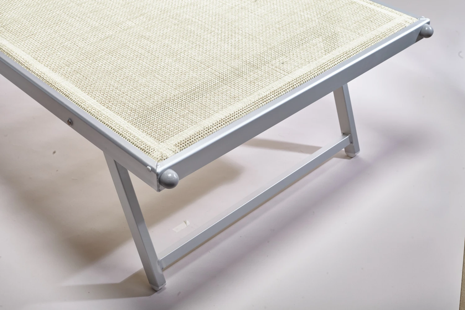 Twin size heavy-duty 3-position folding aluminum sunbed for VIP areas made with extra large structure and high quality sunshade.